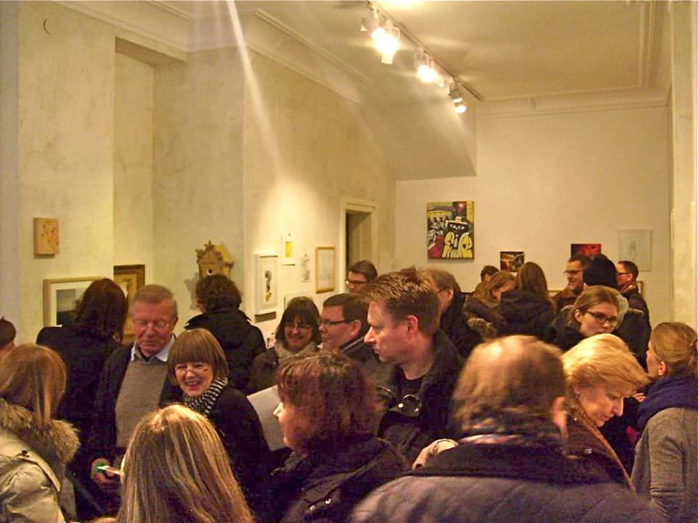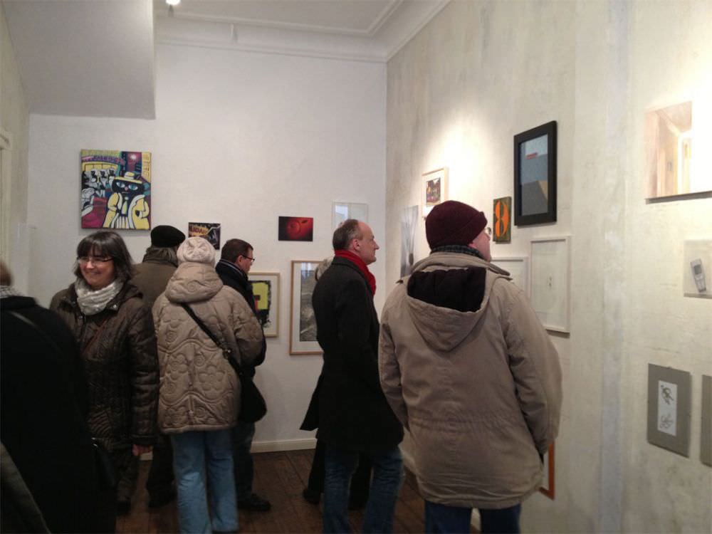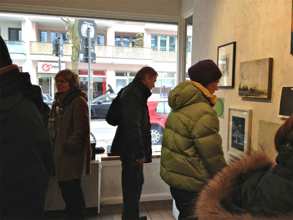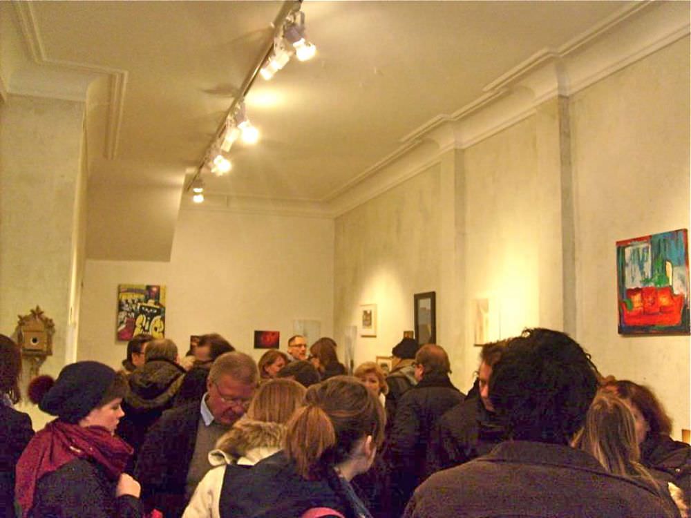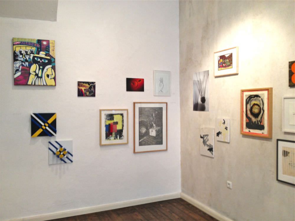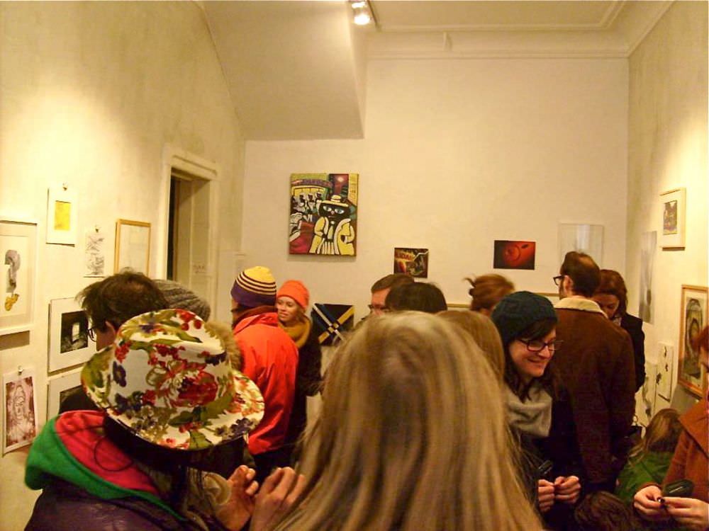 Unser Galerieraum hing bis unter die Decke voll mit Malerei, Zeichnungen und Fotografie und wartete darauf von den uns geneigten Besuchern geleert zu werden. Alle Arbeiten konnten direkt mit nach Hause genommen werden. Vom Verkaufserlös spendeten die Künstler 80% an den nachtspeicher23 e.V..