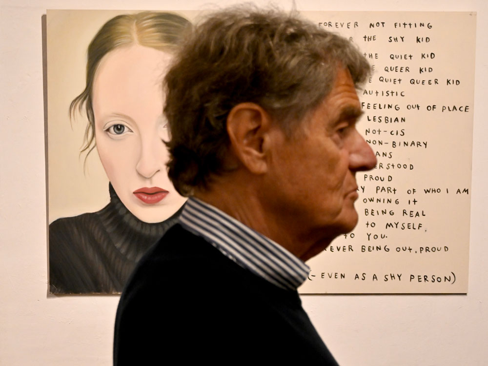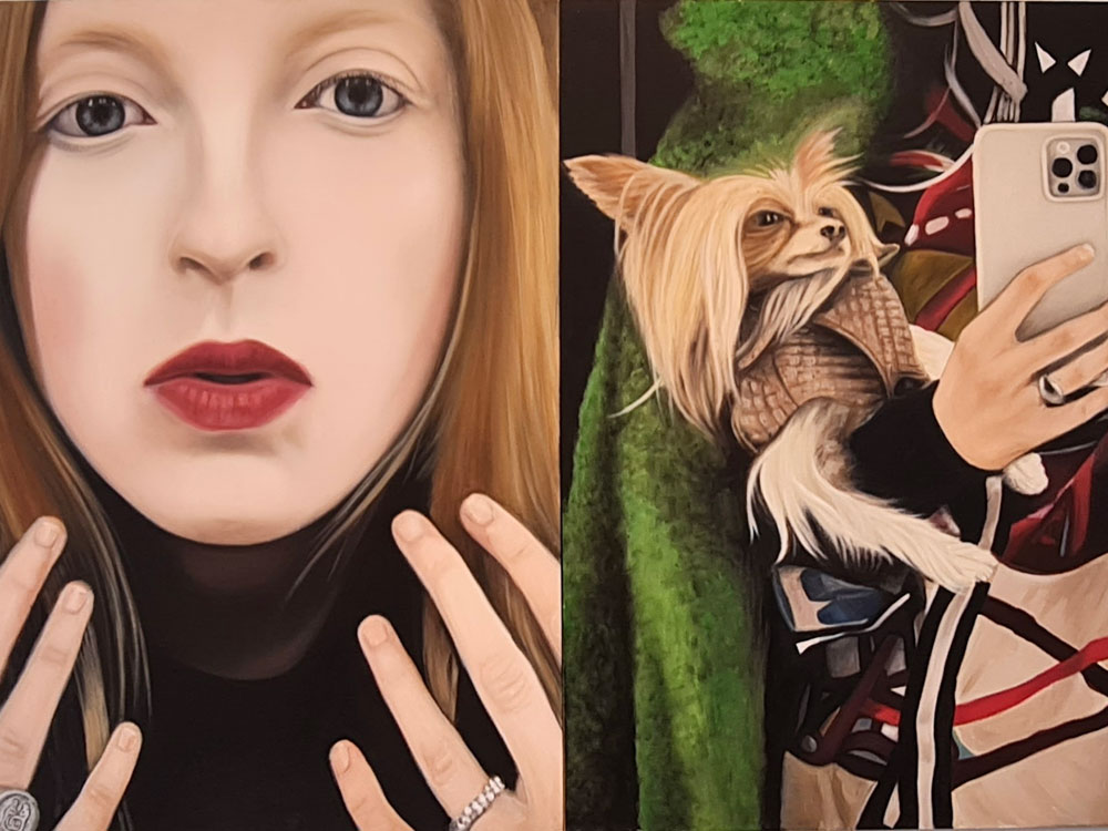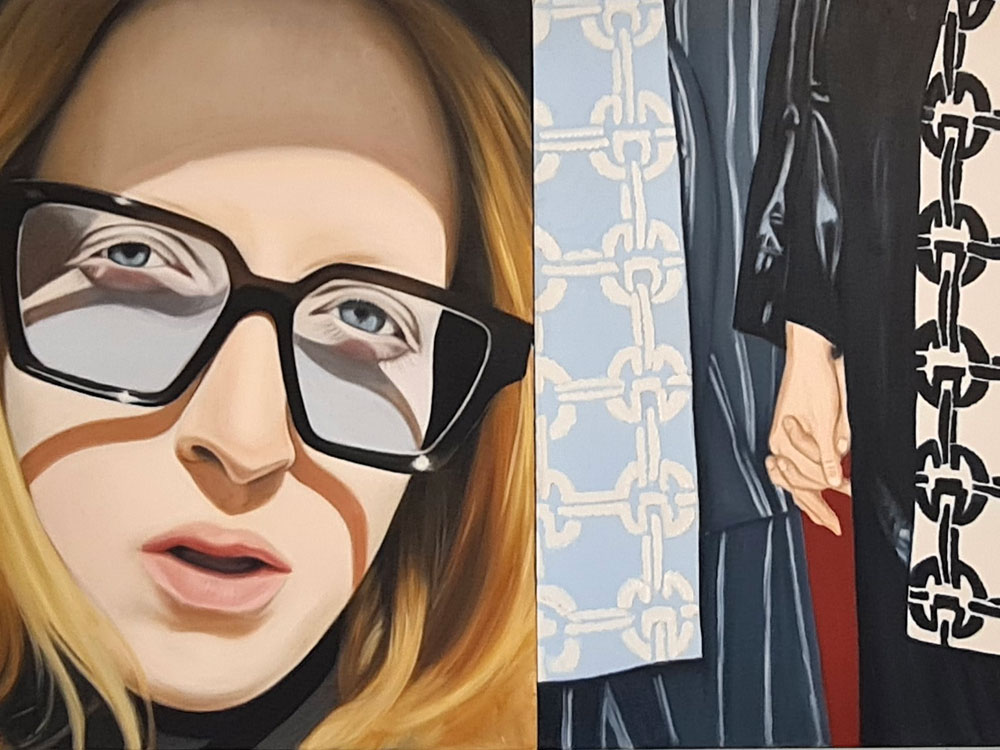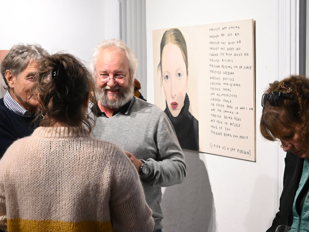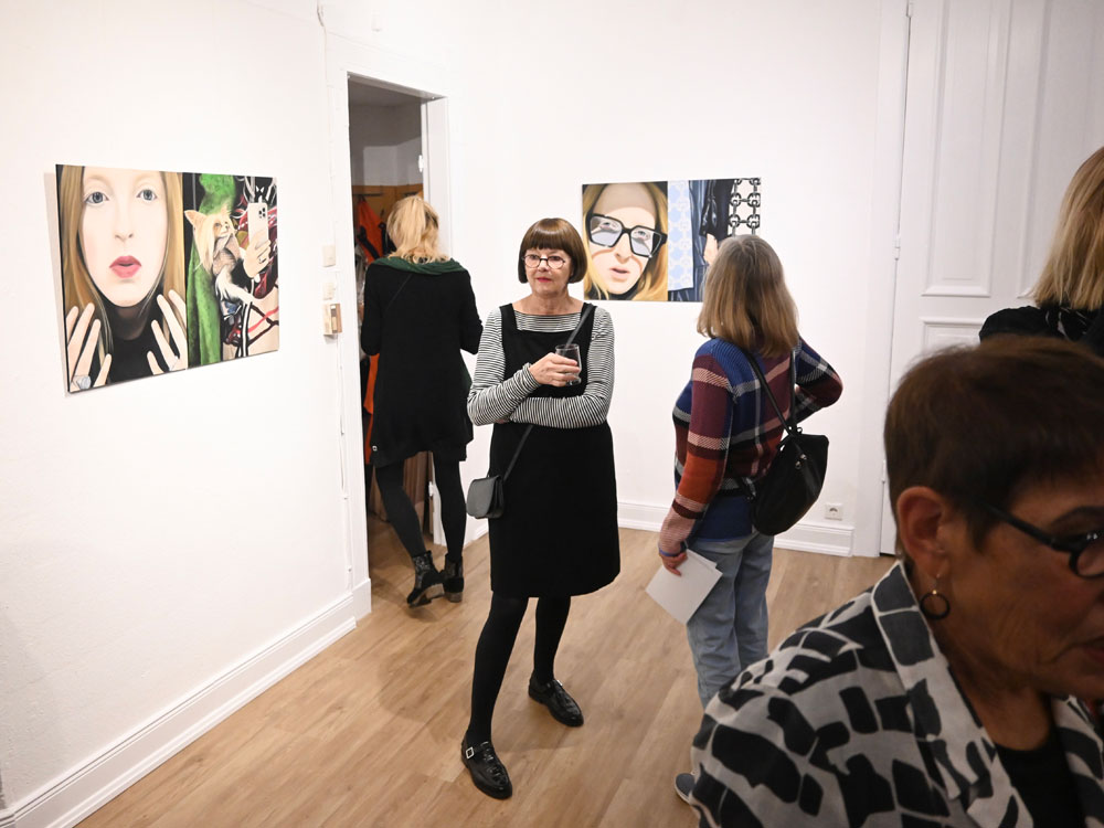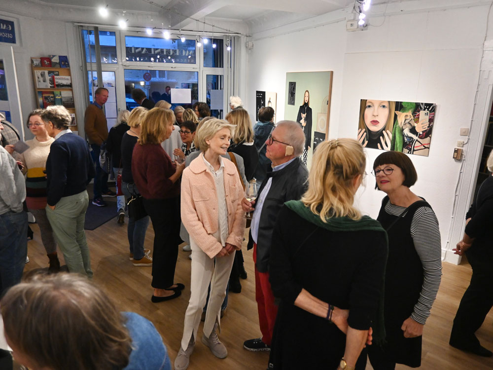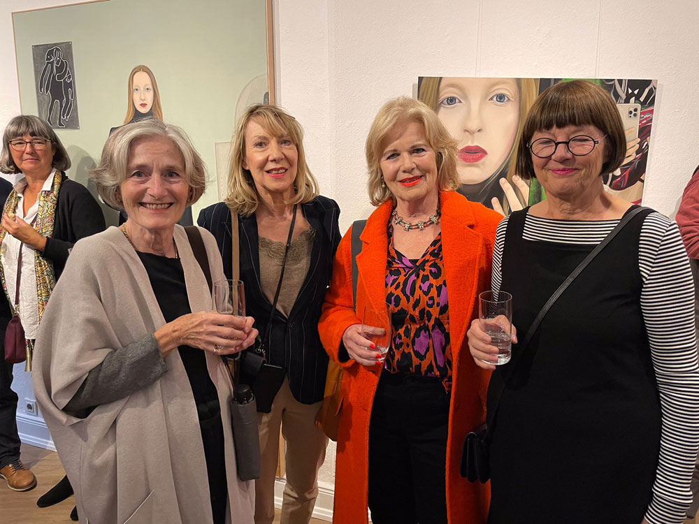 Dasselbe kann man übrigens auch über Kathrin Bick-Müller sagen: Sie ist sich selbst treu geblieben. Nicht nur optisch (und ich kenne sie wirklich schon sehr lange), sondern auch in ihrem tief verwurzelten Bestreben, sich in ihren Werken ständig weiterzuentwickeln und konsequent zu verbessern. Überaus beeindruckend finde ich, dass sie dabei auch radikale Korrekturen nie scheut. Gelangt bei sie kritischer Betrachtung eines Porträts zu der Überzeugung, dass die Balance zwischen Mensch und Umfeld nicht stimmt, übermalt sie entschlossen den Hintergrund, auch wenn sie bereits wochenlang akribisch an den Details und den Accessoires gearbeitet hat, die sie ihren Personen mit viel Humor zuordnet.