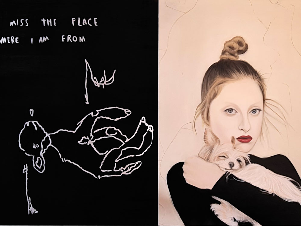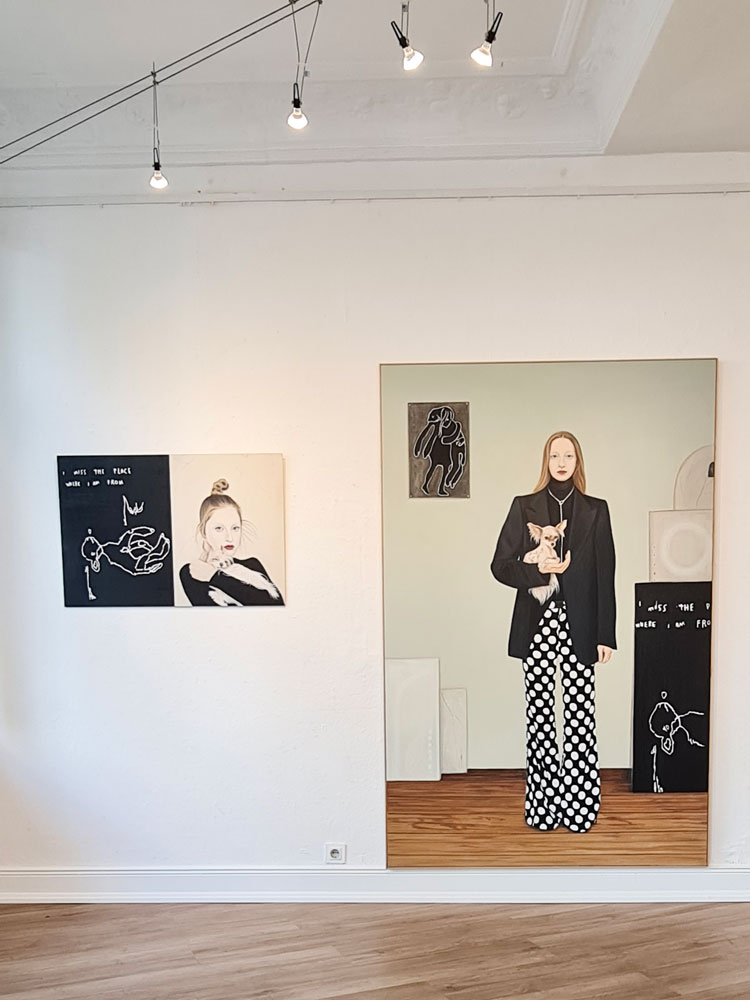 Als sie auf Anouk Lamm Anouk stieß, um die es in dieser Ausstellung geht, war es gleichsam eine Punktlandung. Anouk, gerade einmal 30 Jahre alt und schon ein Shooting-Star der österreichischen Kunstszene, verkörperte mit ihrem feenhaften, ätherischen Gesicht, dem blass geschminktem Teint und ihren ernsten, ausdrucksvollen Augen sozusagen in Reinform genau das, was Kathrin Bick-Müller mit ihren Bildern schon immer darzustellen versucht hatte. Vor zwei Jahren war sie über die Instagram-Seite der Johann König Galerie in Berlin auf die extravagante Wiener Malerin aufmerksam geworden, die auf ihrem eigenen Account eine sehr ungewöhnliche Form gefunden hatte, ihre Anliegen sichtbar zu machen. Denn Anouk postete dort nicht nur ihre überwiegend in Schwarz, Weiß und Beige gehaltenen Werke, sondern in couragierter Offenheit auch alle zentralen Facetten ihres Lebens: Ihr besonderes Aussehen, ihren Autismus und die Liebe zu ihrer Frau, die gleichzeitig ihre Managerin ist. Auch Tiere spielen eine tragende Rolle in ihrem Leben. In ihren Instagram-Posts erscheinen ihr Hund, der auf den exzentrischen Namen Sirius Grace Anouk hört, sowie ihre Katze Moon Fawn. Das künstlerische Schaffen von Anouk und ihr Alltag mit ihren Tieren im Studio lassen sich via Instagram fast tagesaktuell mitverfolgen. Leben und Werk sind eng miteinander verschränkt, denn auch in ihrer Malerei haben mystisch wirkende Tierwesen eine wiederkehrende Präsenz. Der Alltag, die Liebe, die Arbeit, die Extravaganz – in Anouks Oeuvre geht es darum, alle diese Aspekte zu vereinen einer breiten Öffentlichkeit zugänglich zu machen.